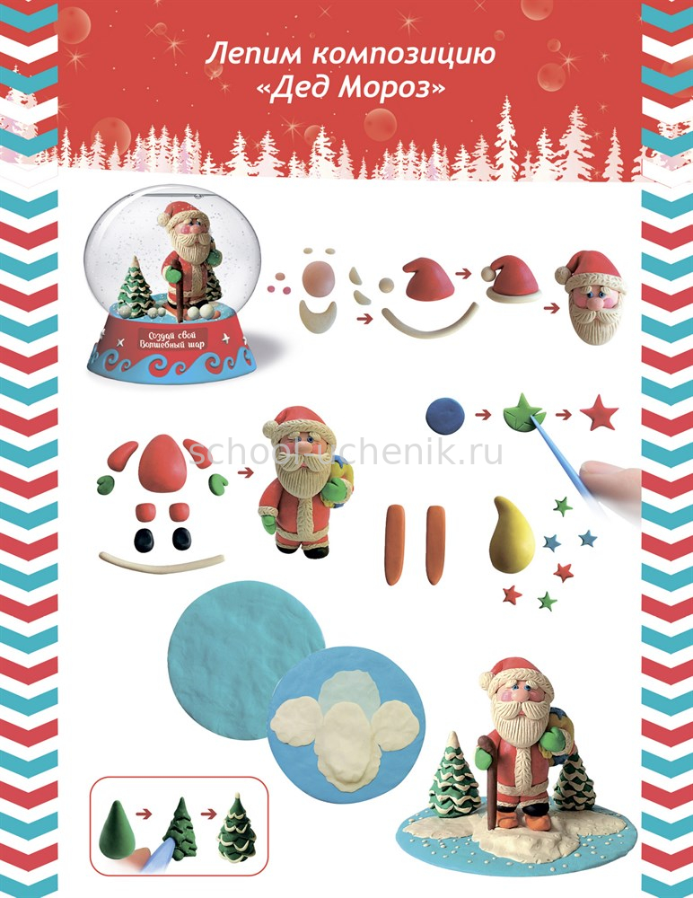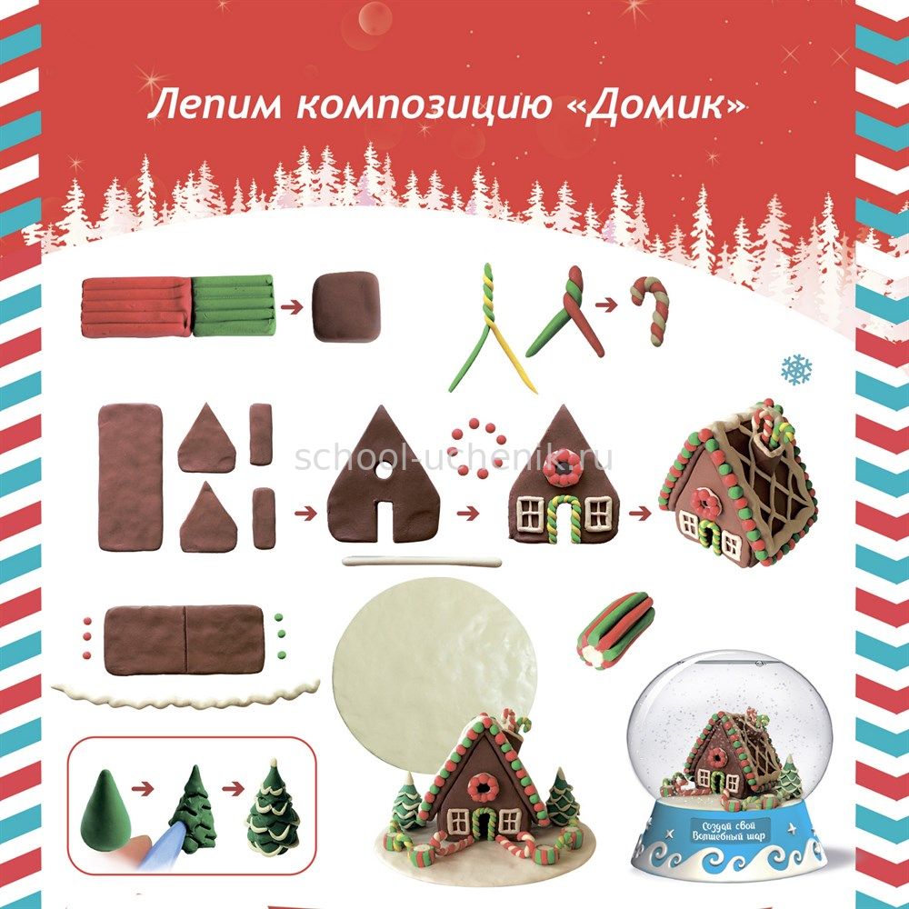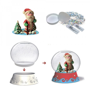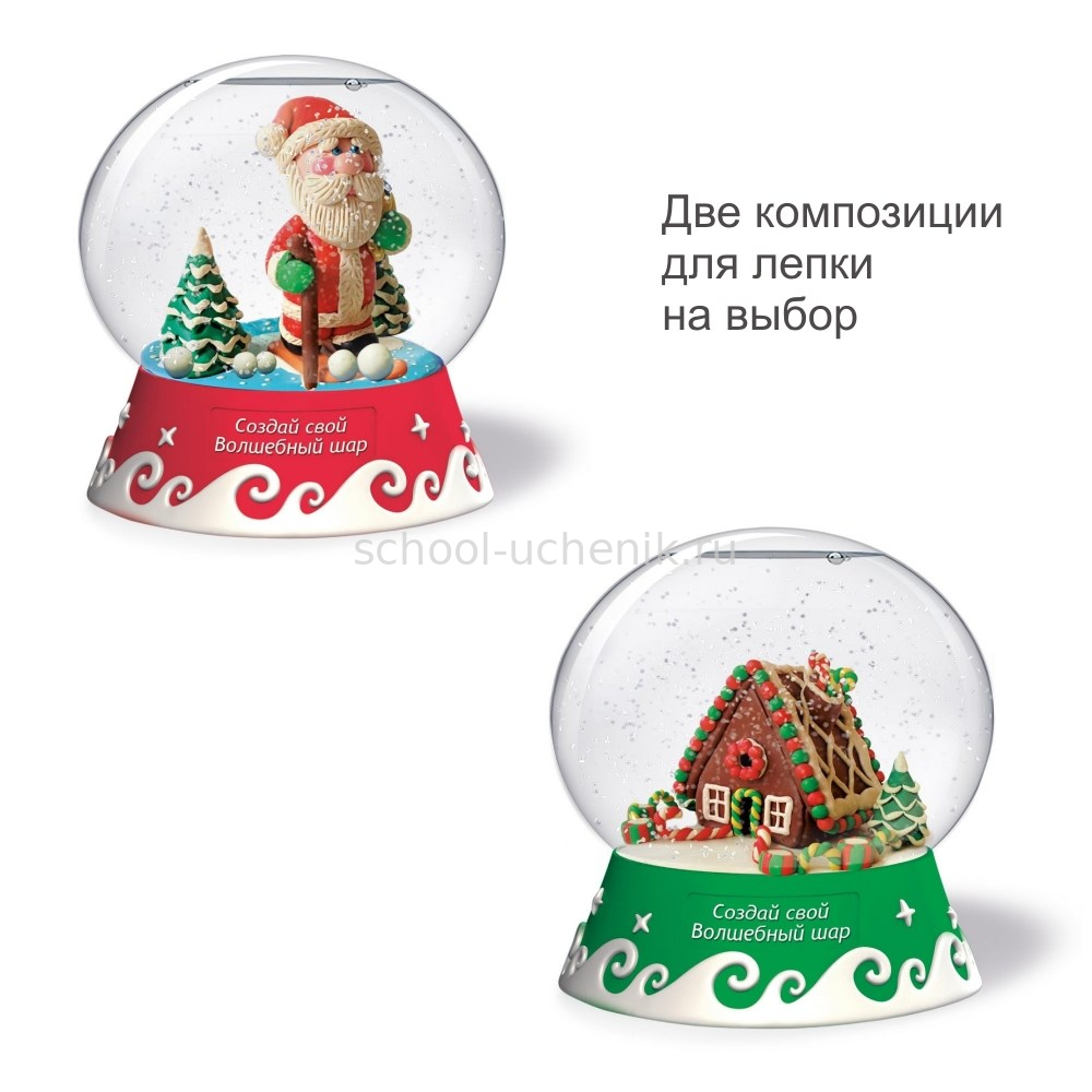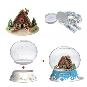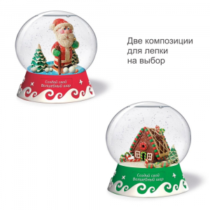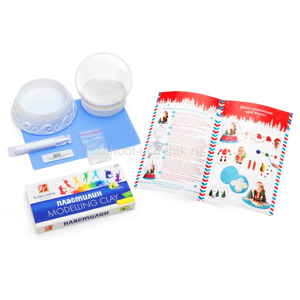 В наборе: подробная инструкция, сферическая основа для шара, фигурная подставка для шара, цветной пластилин, доска для лепки, подставка для композиции, специальные жидкости, блестки для создания снежного эффекта.