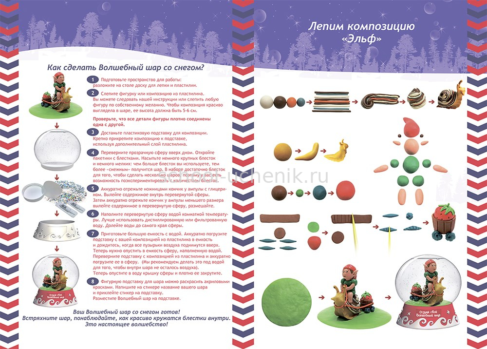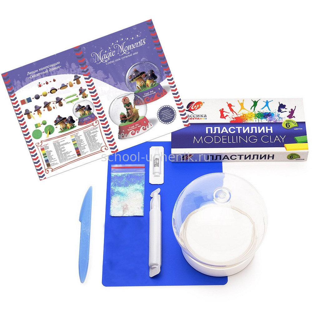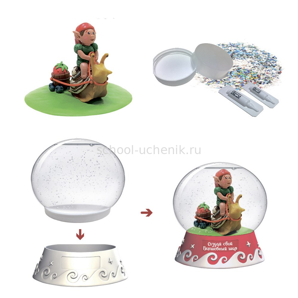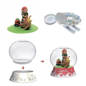 В наборе: подробная инструкция, сферическая основа для шара, фигурная подставка для шара, цветной пластилин, доска для лепки, подставка для композиции, специальные жидкости, блестки для создания снежного эффекта.