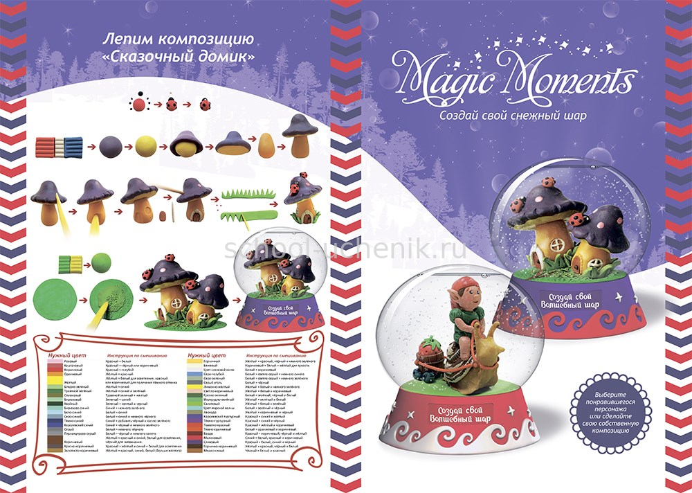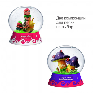 Волшебный шар это сувенир, внутри которого находится целый уютный мир. В наборе есть все необходимое для того, чтобы создать свой снежный шар. Слепите фигурку, следуя подробной инструкции. Прикрепите готовую композицию к подставке, добавьте в сферу воду, блестки, глицерин и специальные жидкости, а затем аккуратно соедините две части шара. Раскрасьте подставку, разместите сферу на постаменте. Ваш Волшебный шар готов!