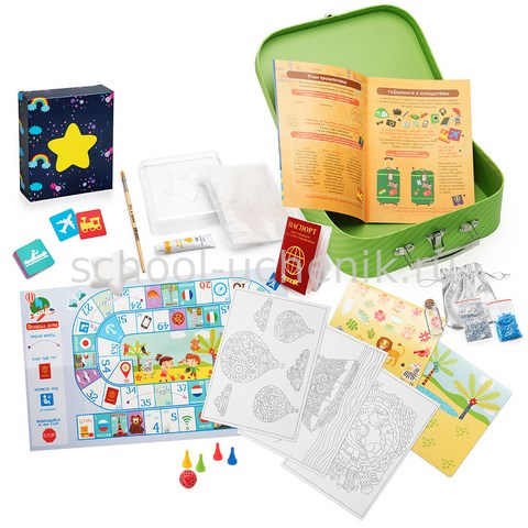 В комплекте: книжка-инструкция с заданиями, паспорт путешественника, игра-ходилка, фишки и кубик для игры, 30 карточек для игры в «Мемо», открытки-раскраски 3 шт., набор для создания поделки «Талисман», набор для создания «Звезды путешественника» из гипса, кисточка, акриловая краска, набор наклеек для украшения чемодана, тематические наклейки.
