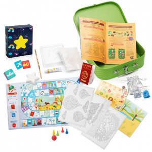 | В наборе: | краски, кисточка, игра-ходилка, фишки, кубик, паспорт путешественника, книжка-инструкция с заданиями, наклейки, открытки-раскраски, 30 карточек для игры, набор для создания поделки «Талисман», набор для создания «Звезды путешественника» из гипса |