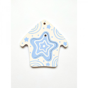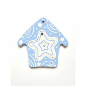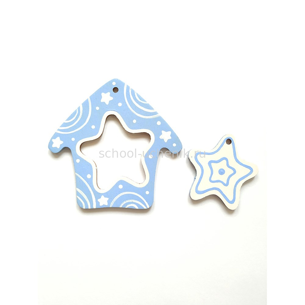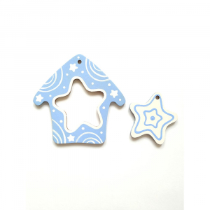 Фигурка разделяется на две части – можно вытащить звездочку из центра и использовать ее как отдельное украшение. Две части одного целого прекрасно сочетаются друг с другом по стилю. Каждая из фигурок снабжена отдельным отверстием, чтобы повесить его на веревочку.