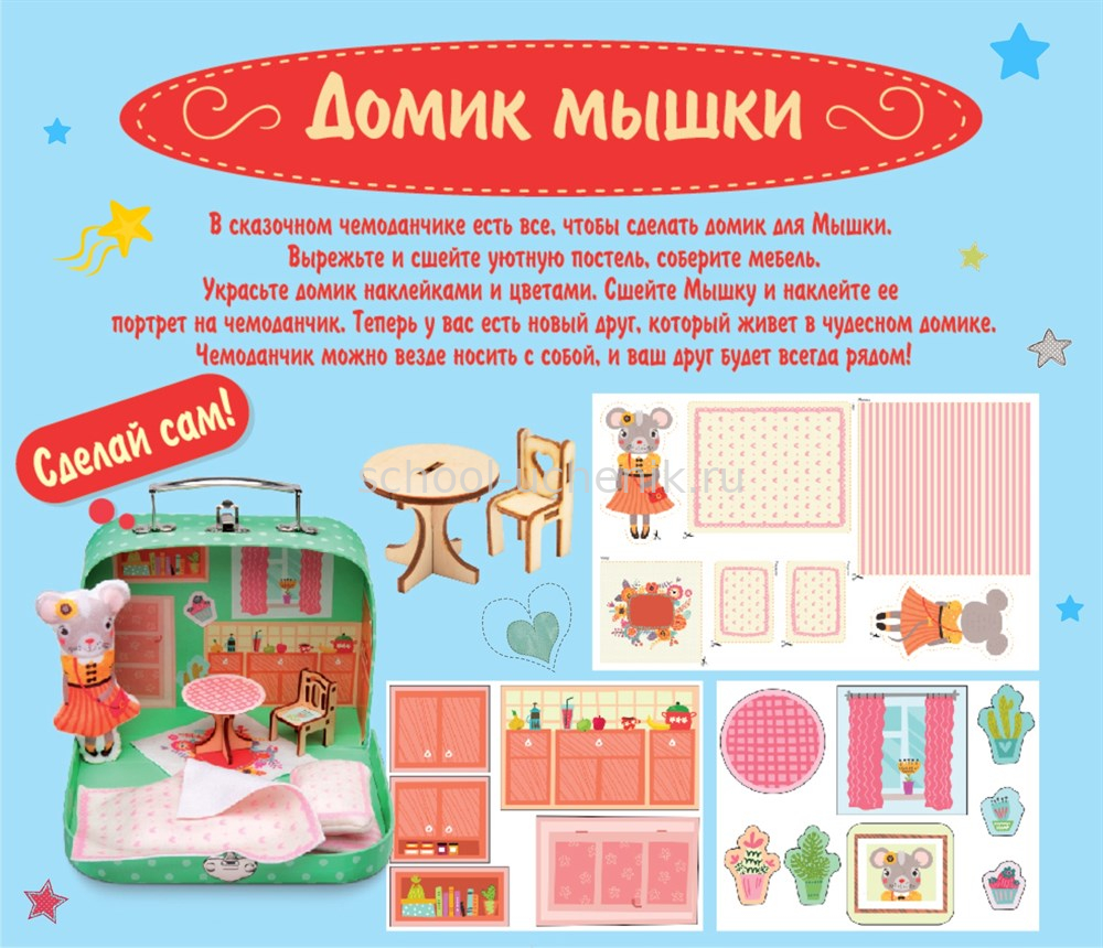 В комплекте: заготовки из ткани с нанесенным изображением для создания игрушки и аксессуаров, синтетический наполнитель, наклейки для украшения домика, деревянные заготовки для создания мебели, чемодан, инструкция на русском языке