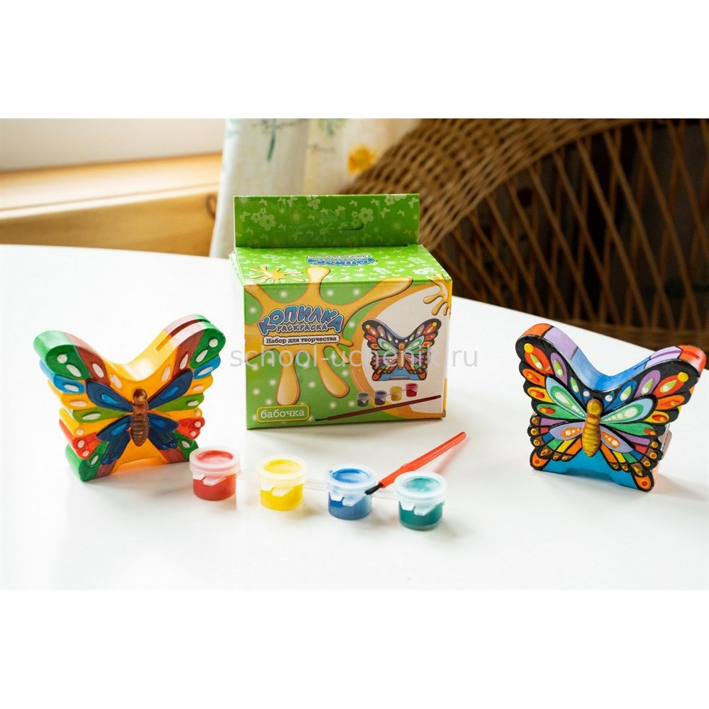 Копилка-бабочка хорошо детализирована. Чтобы аккуратно ее раскрасить, понадобится приложить немало усилий, но это стоит того. Когда краска высохнет, ребенок будет рад использовать свой шедевр и учиться обращаться с деньгами.