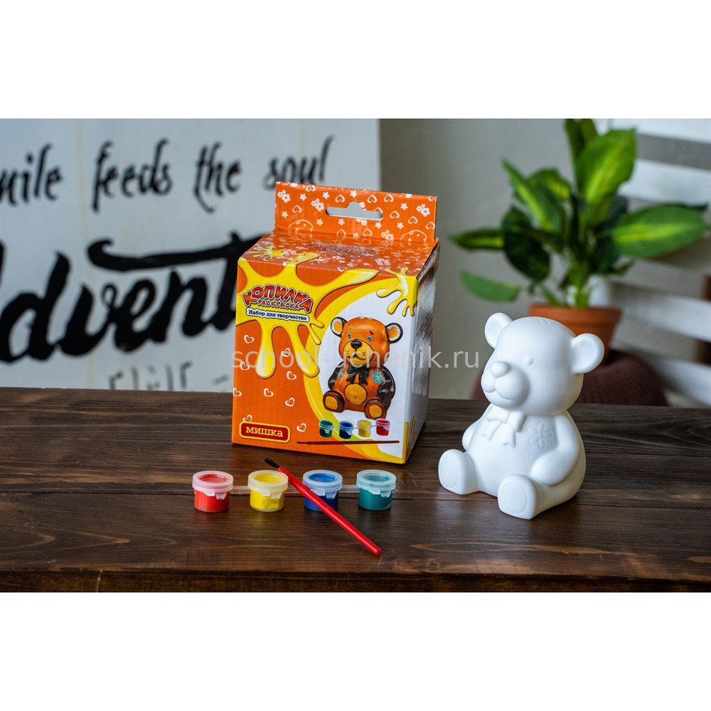 В комплекте: копилка из пластика, краски 4 цветов, кисточка