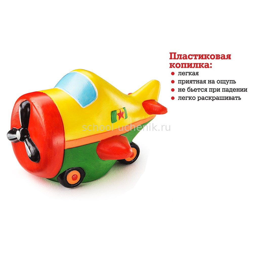 Самолетик — игрушка для мальчишек. А этот самолет еще и настоящая копилка-раскраска, которая надежно сохранит первые сбережения. В наборе есть все, что нужно, чтобы создать красивую поделку: копилка под раскрашивание из пластика, краски основных цветов, кисточка. Нужно тщательно раскрасить все детали — пропеллер, хвост, колеса, крылья, а после можно и поиграть.