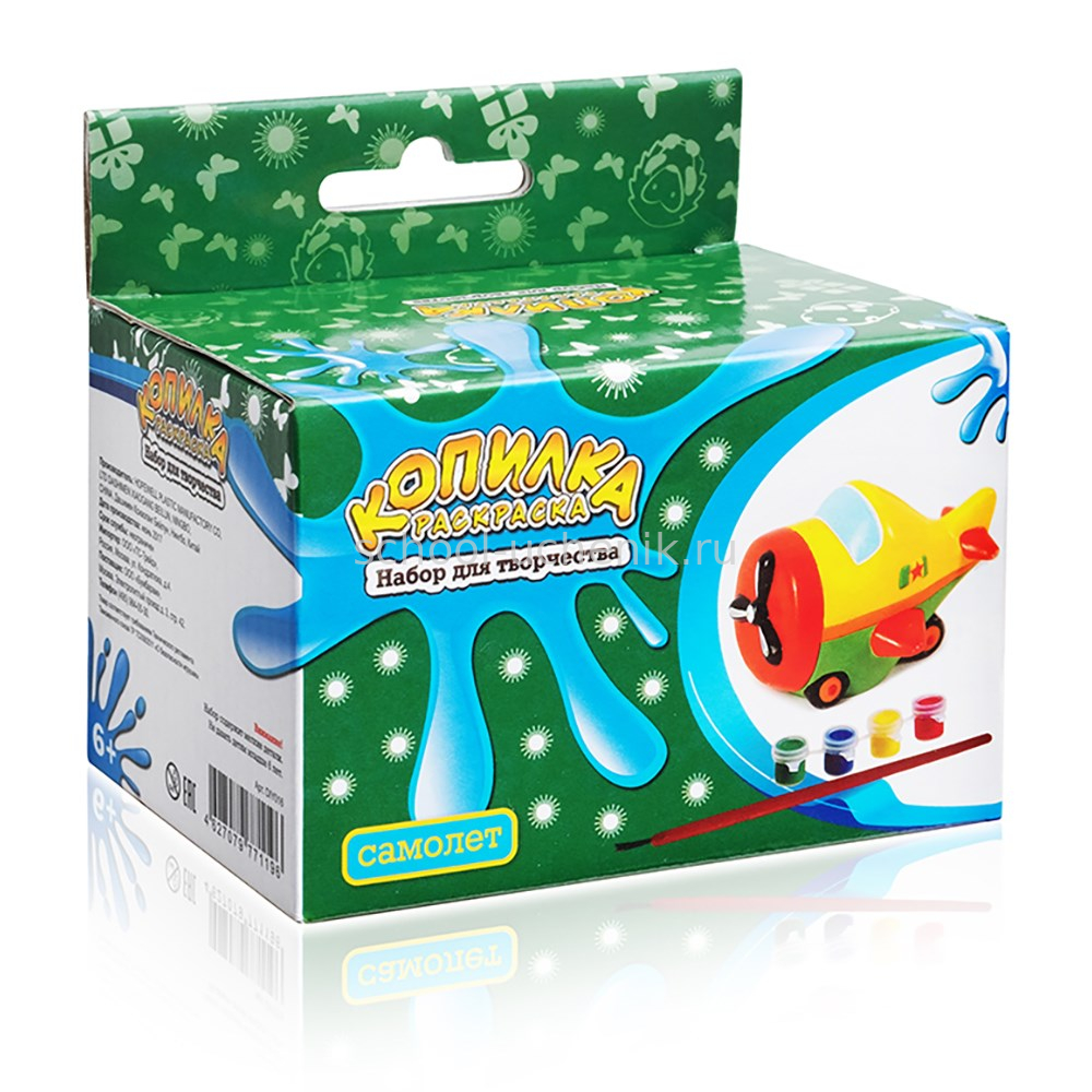 В комплекте: копилка из пластика, краски 4 цветов, кисточка
