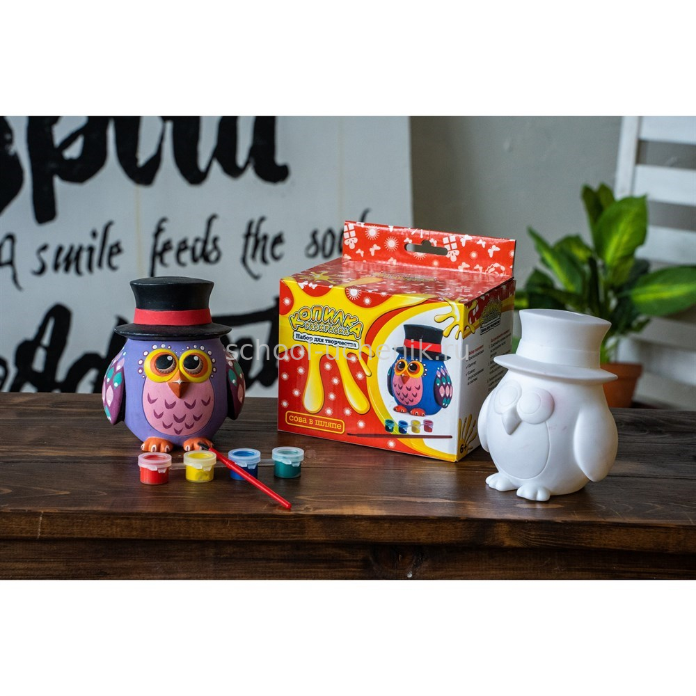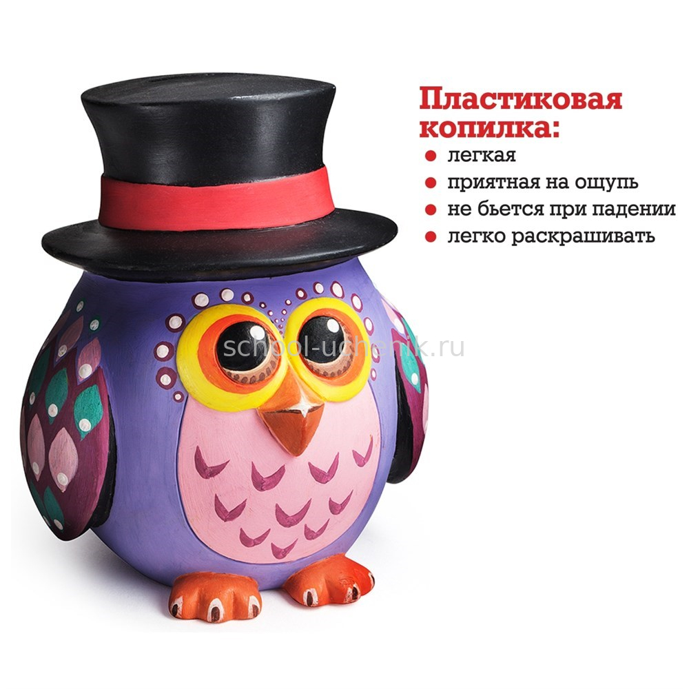Эта копилка-раскраска выполнена в форме одного из самых популярных персонажей нашего времени — совы. Она мудрая, смешная и добрая. Ребенок сможет с легкостью раскрасить этого забавного персонажа, а после хранить в копилке свои сбережения. Набор для творчества включает в себя копилку из пластика, краски и кисточку.