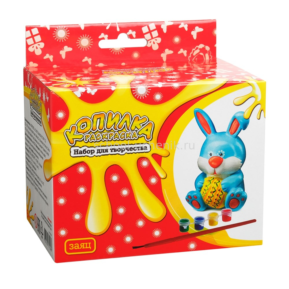 В комплекте: копилка из пластика, краски 4 цветов, кисточка