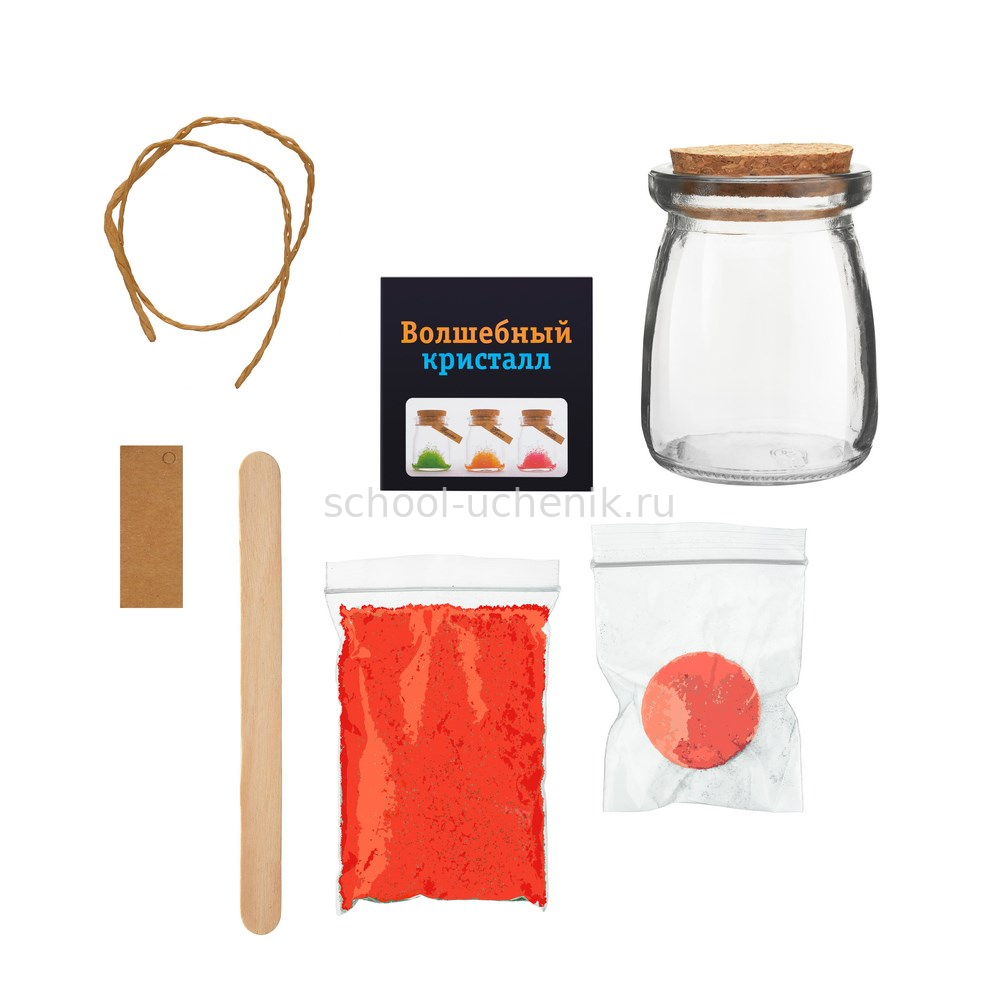В комплекте: баночка с пробкой, кристаллический порошок, кристаллическая таблетка, палочка для перемешивания, веревка, бирка с пожеланием, инструкция на русском языке