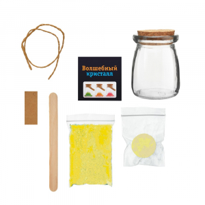 В комплекте: баночка с пробкой, кристаллический порошок, кристаллическая таблетка, палочка для перемешивания, веревка, бирка с пожеланием, инструкция на русском языке