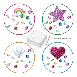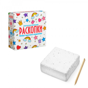 Перед вами набор для юных кладоискателей. Что внутри? Чудесные сокровища! Снимайте слои породы с помощью специального инструмента. Для того чтобы стало легче раскапывать сокровища, рекомендуем смочить брусок водой. Промойте находки и высушите. Сокровища теперь ваши!