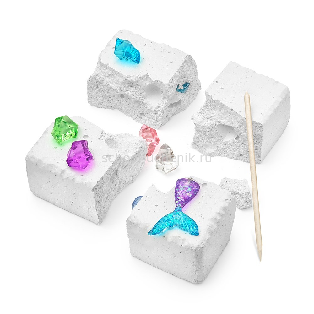 В наборе: деревянный стек для дробления, окаменелый грунт с сокровищами (россыпь разноцветных находок из пластика, фигурка-подвеска в форме хвоста русалки). Цвета находок в ассортименте.