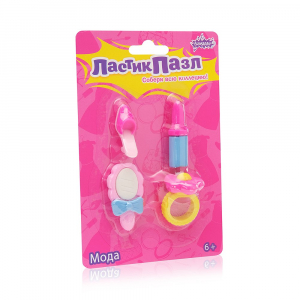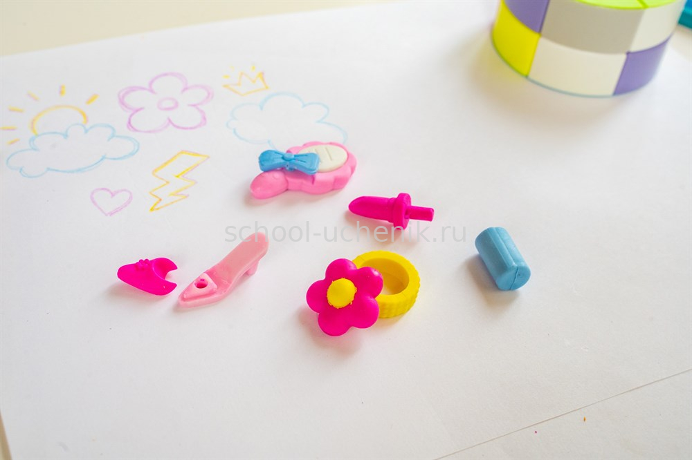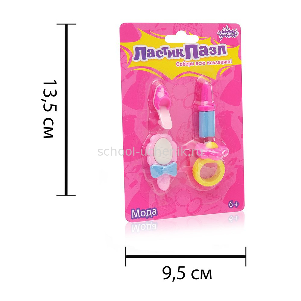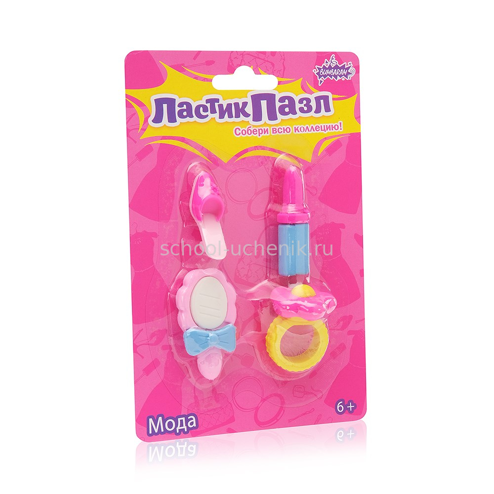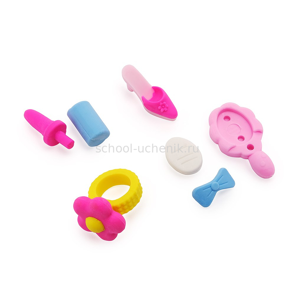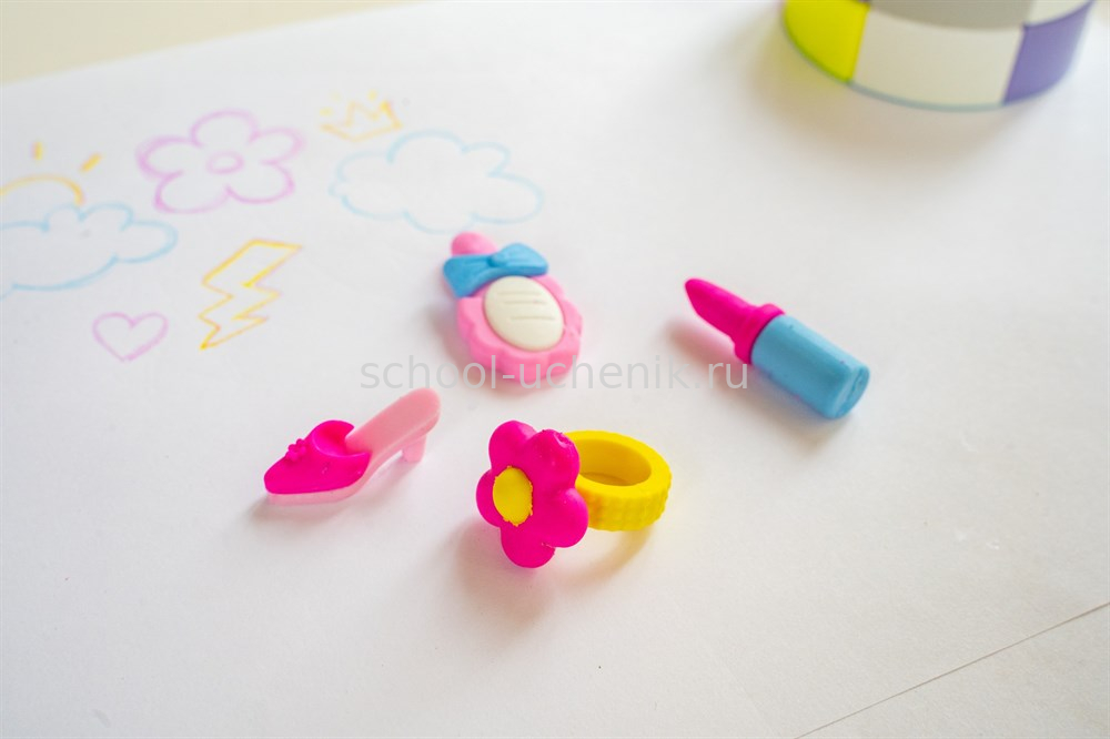 Эти необычные ластики-пазлы порадуют любую модницу! В наборе сразу несколько фигурных ластиков из мягкой резины, выполненных в форме различных предметов одежды и аксессуаров. Такие ластики привлекут всеобщее внимание в школе, а также пригодятся для игр или для создания кукольных миниатюр.