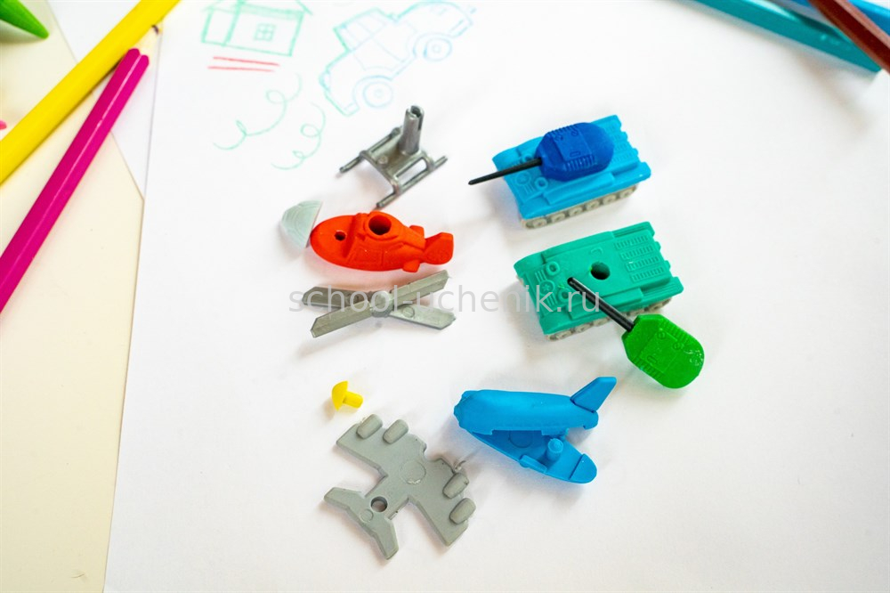 Этот набор подойдет для всех любителей военной техники. Четыре детализированные фигурки разбираются на части, превращая ластики в интересные пазлы для развития пространственного мышления. Два танка, самолет и вертолет станут прекрасным пополнением коллекции, необычными сувенирами.