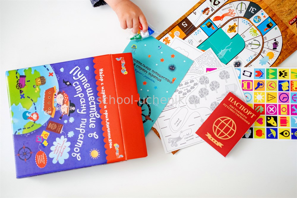 Внутри этого набора скрывается необычное приключение по стране пиратов. Предложите ребенку пройти все задания из книжки-инструкции и сыграть в любимую всеми игру-ходилку. Также в коробке каждого маленького путешественника ожидает сюрприз — настоящий паспорт путешественника! Заполните его визами-наклейками, которые даются за каждое выполненное задание.