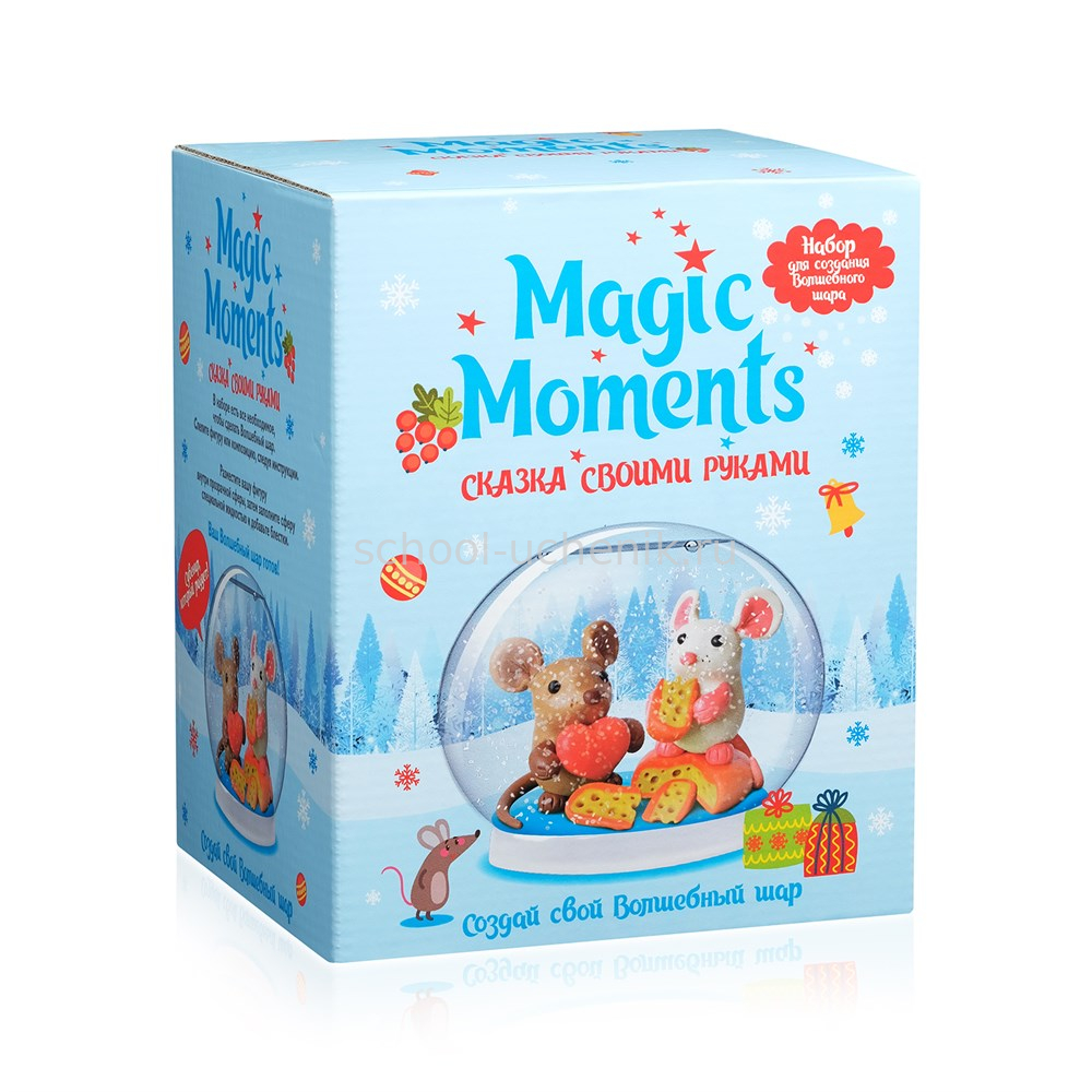 Перед вами набор для создания собственного снежного шара. Это популярный сувенир с фигурками и снежинками, которые кружатся внутри прозрачной сферы. В наборе есть все необходимое для того, чтобы создать свой Волшебный шар. Слепите фигурку, пользуясь нашей пошаговой инструкцией. Прикрепите готовую композицию к подставке, добавьте в сферу воду, блестки, глицерин и специальные жидкости, а затем аккуратно соедините две части шара. Ваш Волшебный шар готов!
