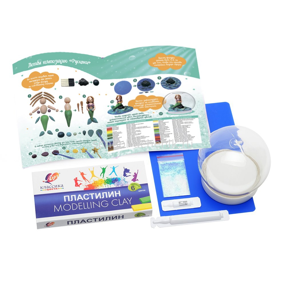 В наборе: подробная инструкция, сферическая основа для шара, цветной пластилин, доска для лепки, подставка для композиции, специальные жидкости, блестки для создания снежного эффекта.