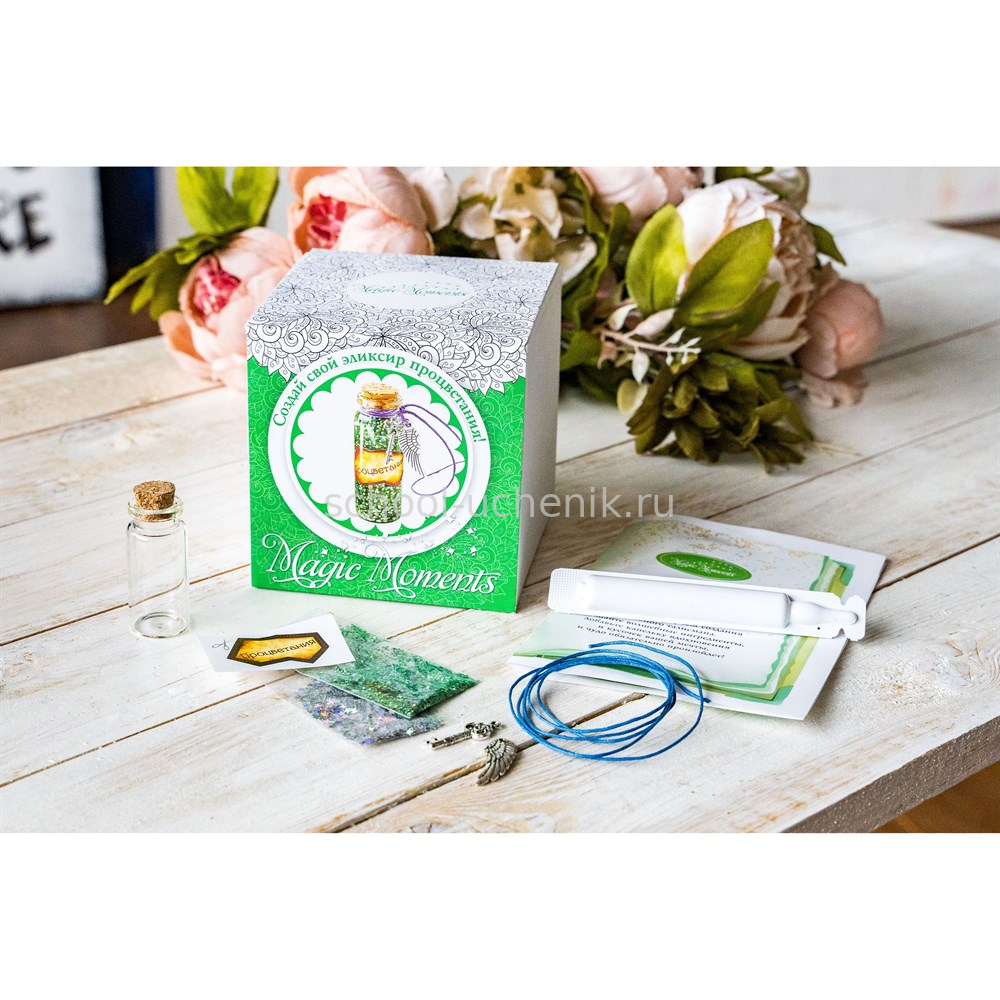 В комплекте: бутылочка с пробкой, ампула с глицерином, цветные блестки, серебряные блестки, наклейка, шнурок для бутылочки, подвески