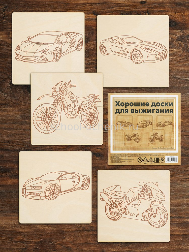 Набор из 5 деревянных заготовок понравится мальчикам, которые увлекаются выжиганием или раскрашиванием. На каждую из досок нанесены контурные изображения крутого транспорта. Доски выполнены из качественной березовой фанеры. Поверхность отлично отшлифована, ровная, без шероховатостей и зазубрин.
