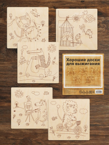 Набор из 5 деревянных заготовок подойдет для выжигания или раскрашивания. На каждую из досок нанесены контурные изображения. Доски выполнены из качественной березовой фанеры. Поверхность отлично отшлифована, ровная, без шероховатостей и зазубрин.
