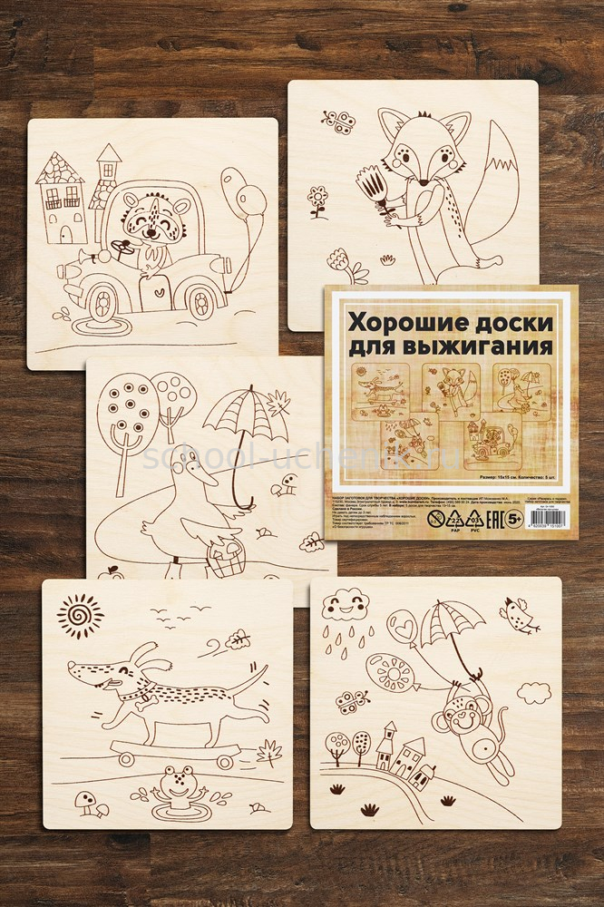 Набор из 5 деревянных заготовок с контурными рисунками для выжигания или раскрашивания. На каждую из досок нанесено детализированное изображение. Доски выполнены из качественной березовой фанеры. Поверхность отлично отшлифована, ровная, без шероховатостей и зазубрин.