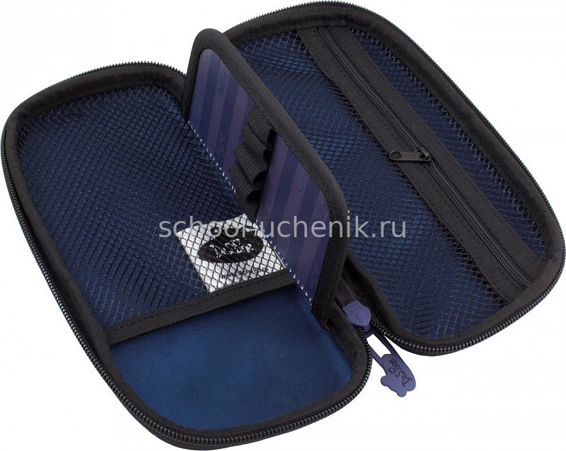 Пенал имеет одно большое отделение, разделенное перегородкой, на которой удобно можно разместить все ручки и карандаши, так же имеется удобное отделение-сеточка на молнии.