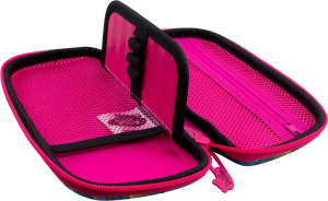 Пенал имеет одно большое отделение, разделенное перегородкой, на которой удобно можно разместить все ручки и карандаши, так же имеется удобное отделение-сеточка на молнии.