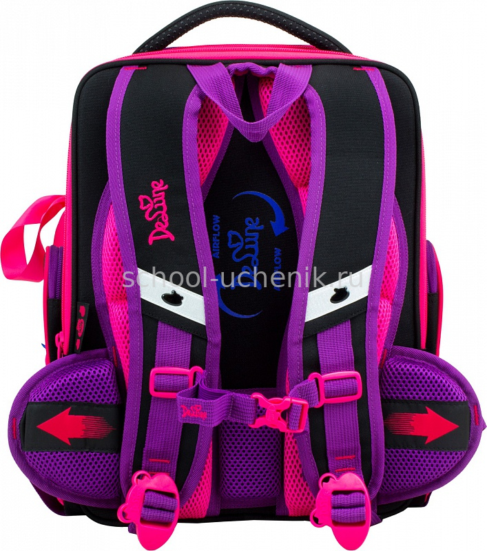 На передней части ранца расположен большой карман с отделением для письменных принадлежностей и два боковых кармана на молнии + карман сеточка для бутылок.