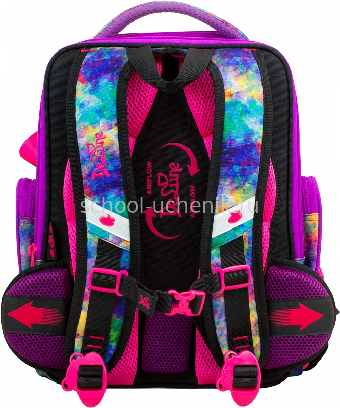 На передней части ранца расположен большой карман с отделением для письменных принадлежностей и два боковых кармана на молнии + карман сеточка для бутылок.