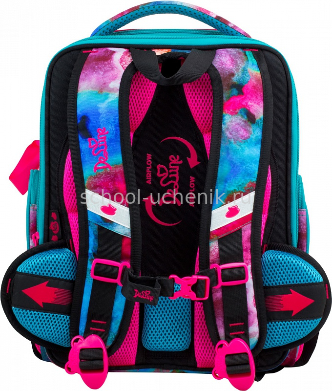 На передней части ранца расположен большой карман с отделением для письменных принадлежностей и два боковых кармана на молнии + карман сеточка для бутылок.