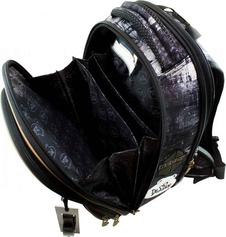 Ранец имеет 3 отделения и карман для пенала. При открытии центрального отделения раздвигаются разделители (книжка). В переднем отделении можно удобно разместить классические тетради и другие принадлежности для школы.