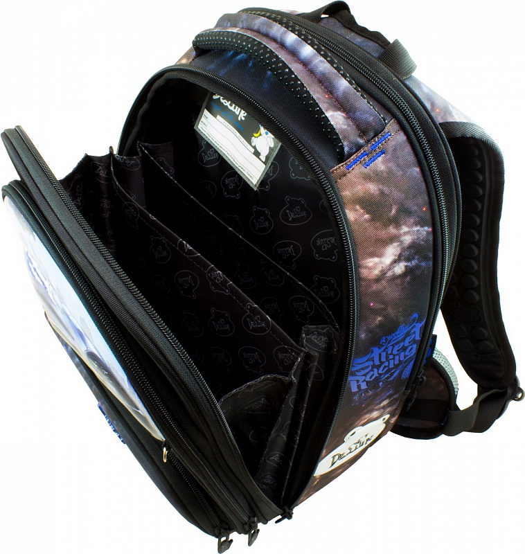 Ранец имеет 3 отделения и карман для пенала. При открытии центрального отделения раздвигаются разделители (книжка). В переднем отделении можно удобно разместить классические тетради и другие принадлежности для школы.