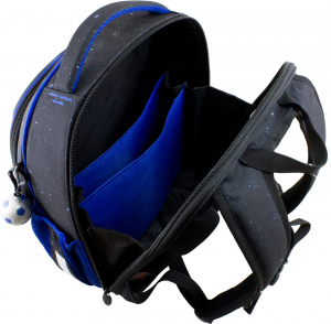 В переднем отделении место для тетрадей и органайзер для письменных принадлежностей.