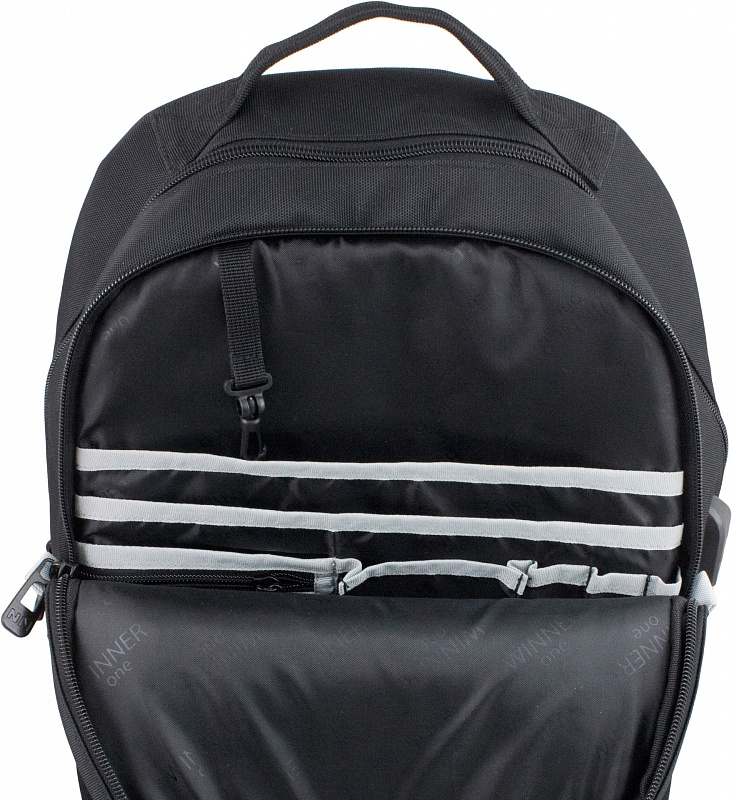 Во втором отделении органайзер для письменных принадлежностей, с карабином для ключей или пропуска.