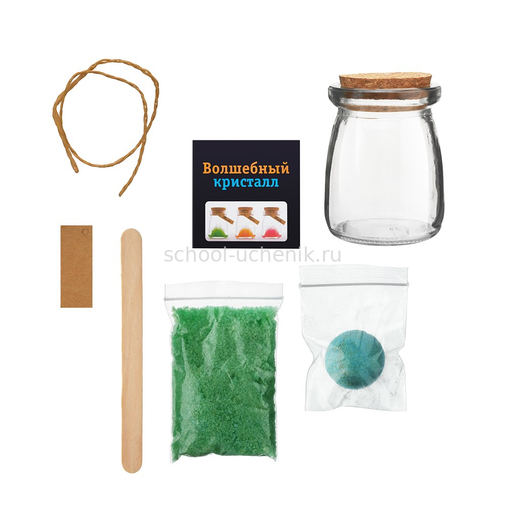 В комплекте: баночка с пробкой, кристаллический порошок, кристаллическая таблетка, палочка для перемешивания, веревка, бирка с пожеланием, инструкция на русском языке