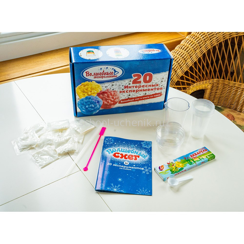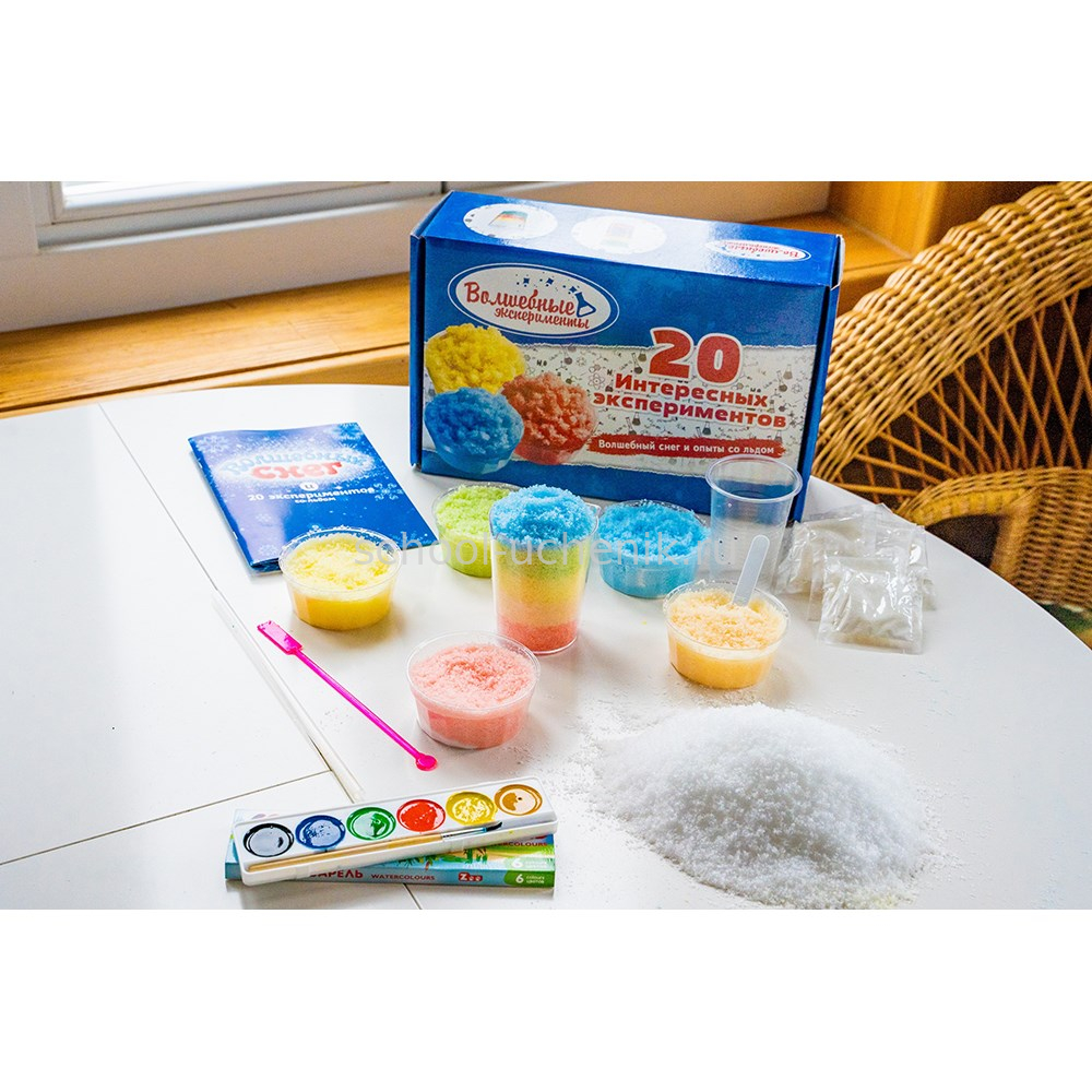 В наборе: Волшебный снег 100 г, краски, кисть, мерный стакан, мерная ложечка, пластиковая трубка, пластиковая палочка для размешивания, емкости для экспериментов, цветной буклет с подробной информацией по проведению опытов