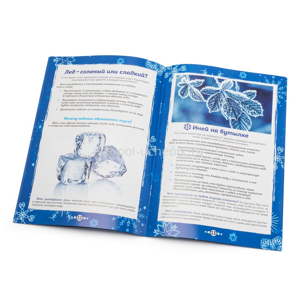 С большим набором «Волшебный снег и 20 опытом со льдом» вы сможете сделать много Волшебного снега, а также провести ряд захватывающих экспериментов и узнавать много нового. Например, о том, что снег бывает не только холодным, а радуга может быть снежной, ледяной или водяной. В наборе вы найдете подробную инструкцию с описаниями опытов и увлекательными рассказами о свойствах снега и льда.