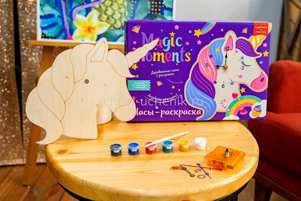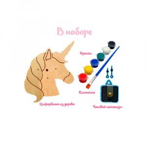 Часы-раскраска с циферблатом в форме единорога – замечательный подарок для всех, кто верит в чудеса! Такой оригинальный сувенир можно сделать своими руками. Внутри красивой коробки: деревянная заготовка, часовой механизм, краски и кисточка. Придумайте дизайн для вашего авторского сувенира или воспользуйтесь схемой раскрашивания, которая размещена на коробке. Для работы часового механизма дополнительно понадобится батарейка типа АА (в комплект не входит).