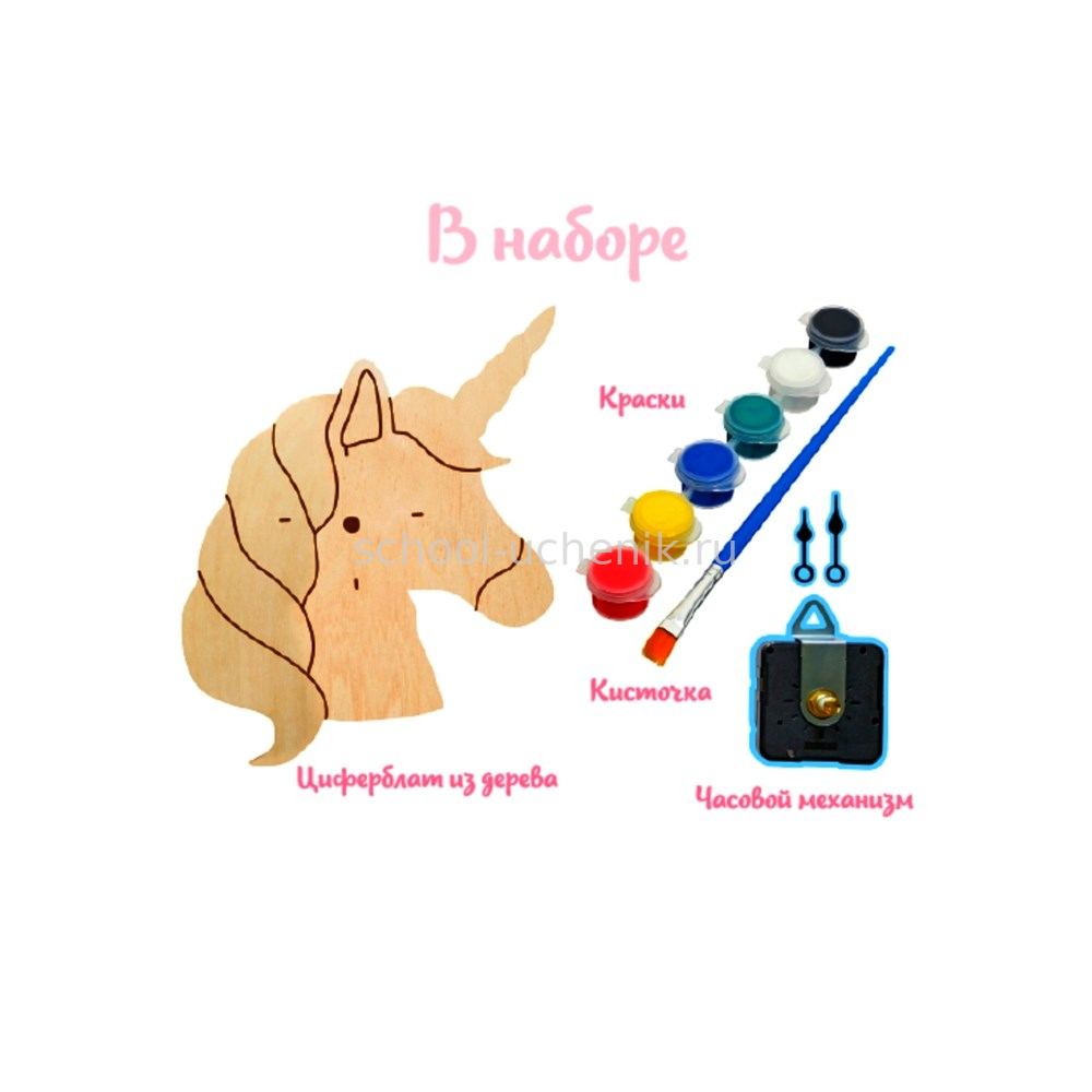 В наборе: деревянная заготовка под раскрашивание, часовой механизм, краски и кисточка.