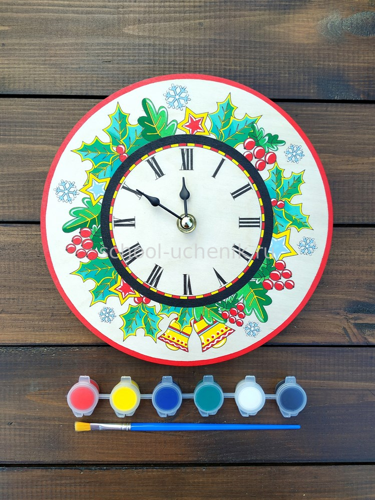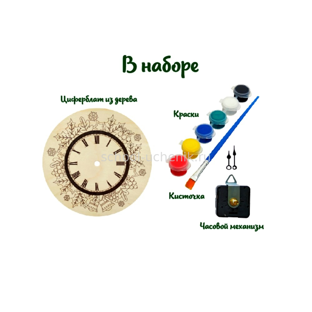 В наборе: деревянная заготовка под раскрашивание, часовой механизм, краски и кисточка