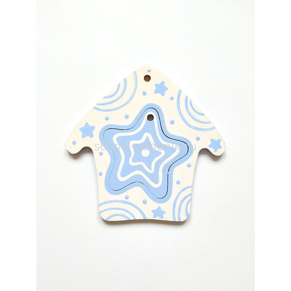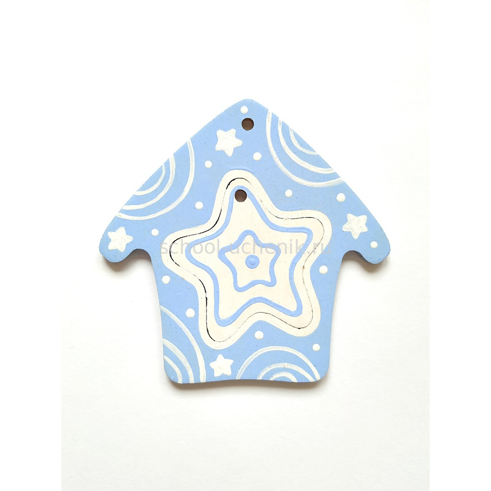 Фигурка разделяется на две части – можно вытащить звездочку из центра и использовать ее как отдельное украшение. Две части одного целого прекрасно сочетаются друг с другом по стилю. Каждая из фигурок снабжена отдельным отверстием, чтобы повесить его на веревочку.