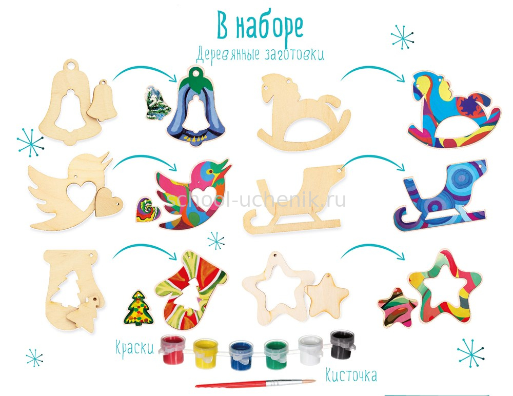 | В наборе: | краски, кисточка, деревянные заготовки |