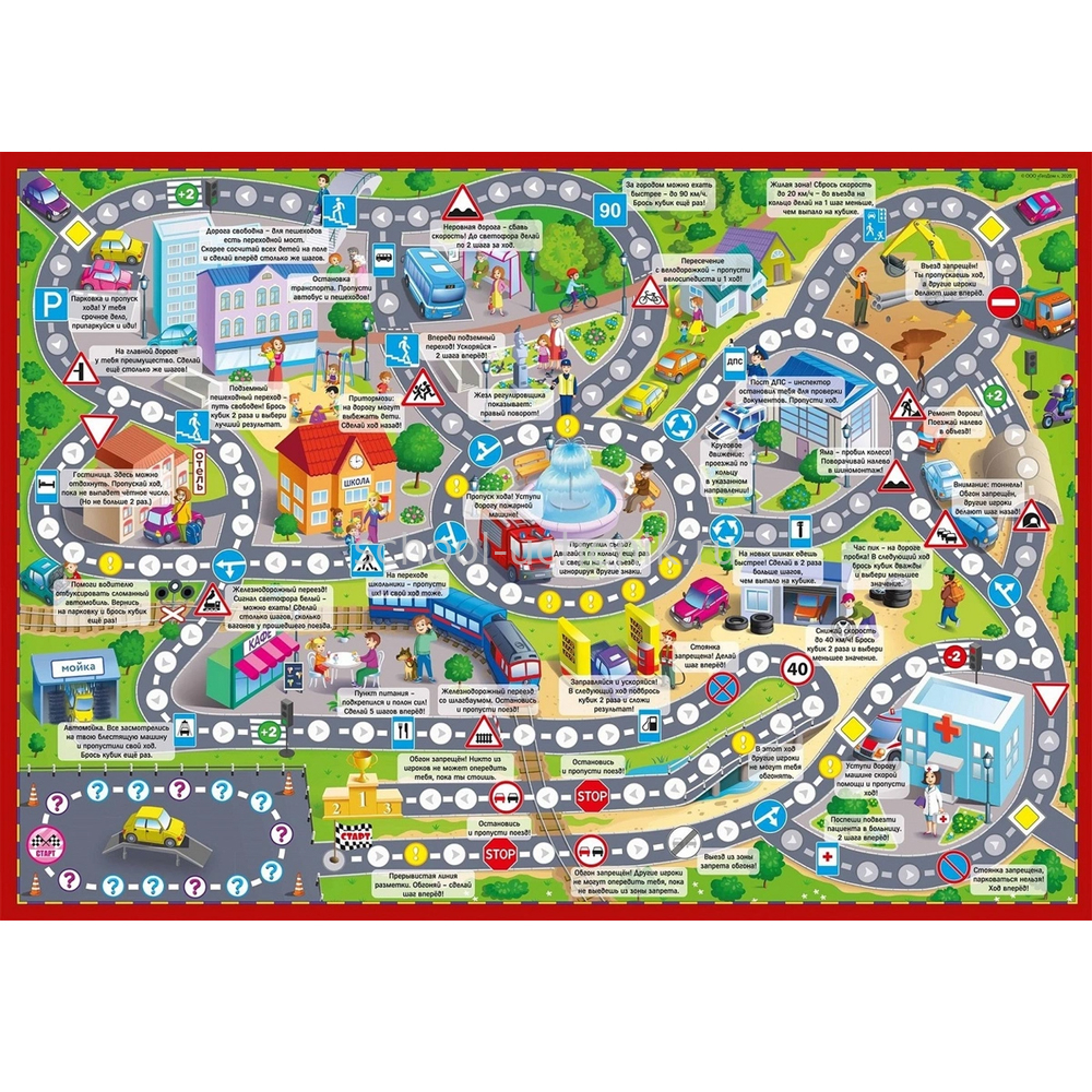 Комплектация:Игровое поле 59х42 cм, карточки с вопросами, карточки - водительские удостоверения, кубик, 4 фишки, правила.