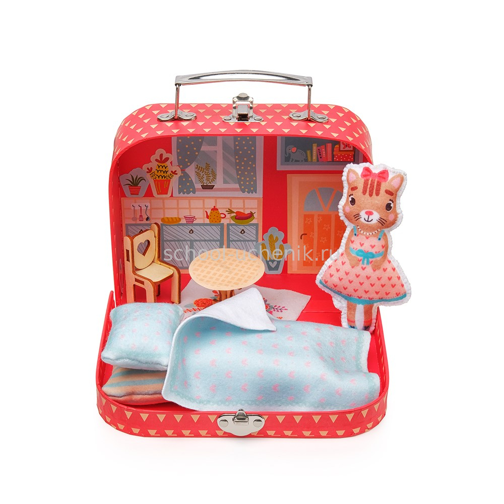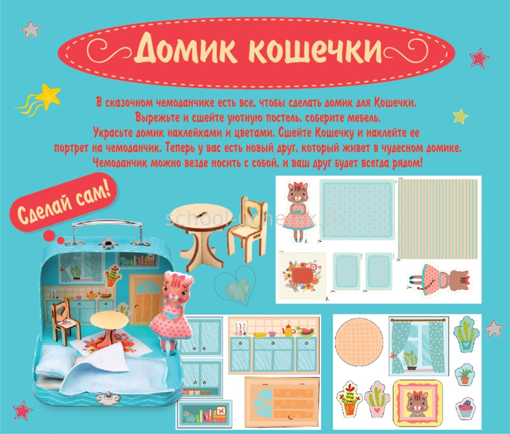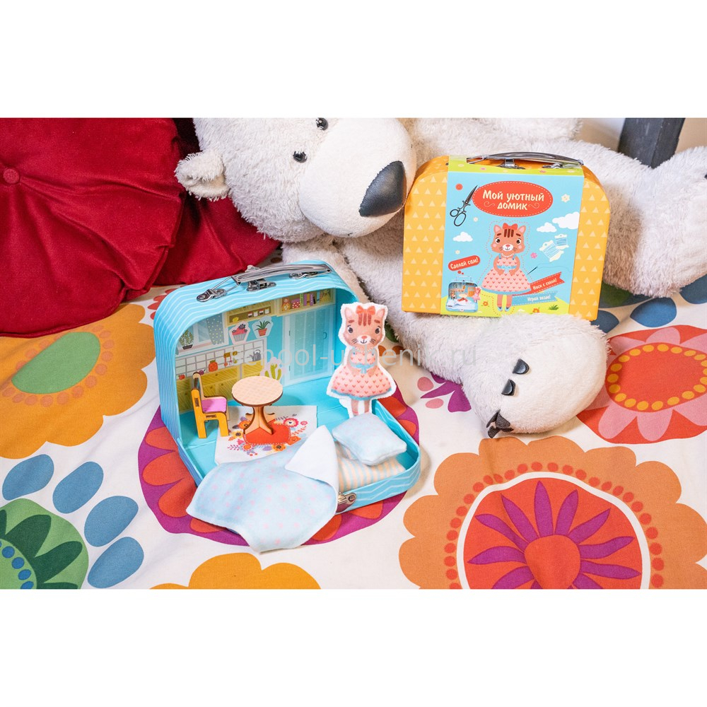 В комплекте: заготовки из ткани с нанесенным изображением для создания игрушки и аксессуаров, синтетический наполнитель, наклейки для украшения домика, деревянные заготовки для создания мебели, чемодан, инструкция на русском языке