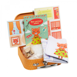 В комплекте: заготовки из ткани с нанесенным изображением для создания игрушки и аксессуаров, синтетический наполнитель, наклейки для украшения домика, деревянные заготовки для создания мебели, чемодан, инструкция на русском языке