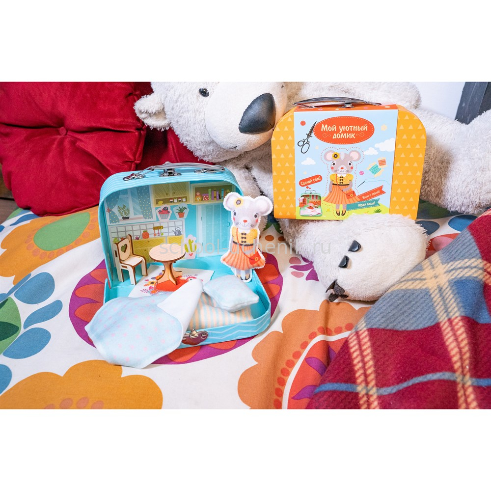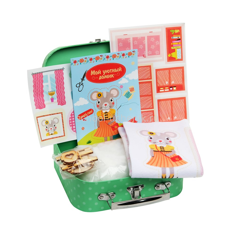 В комплекте: заготовки из ткани с нанесенным изображением для создания игрушки и аксессуаров, синтетический наполнитель, наклейки для украшения домика, деревянные заготовки для создания мебели, чемодан, инструкция на русском языке