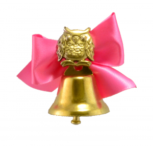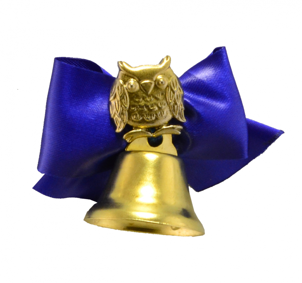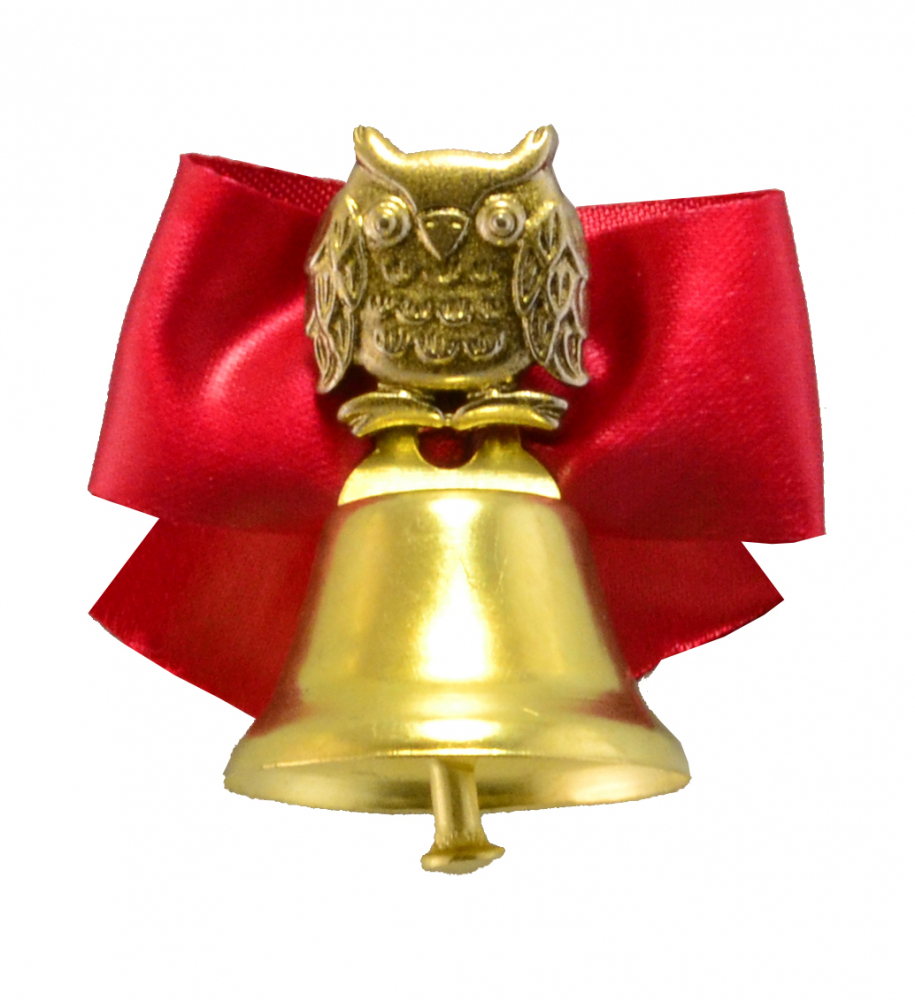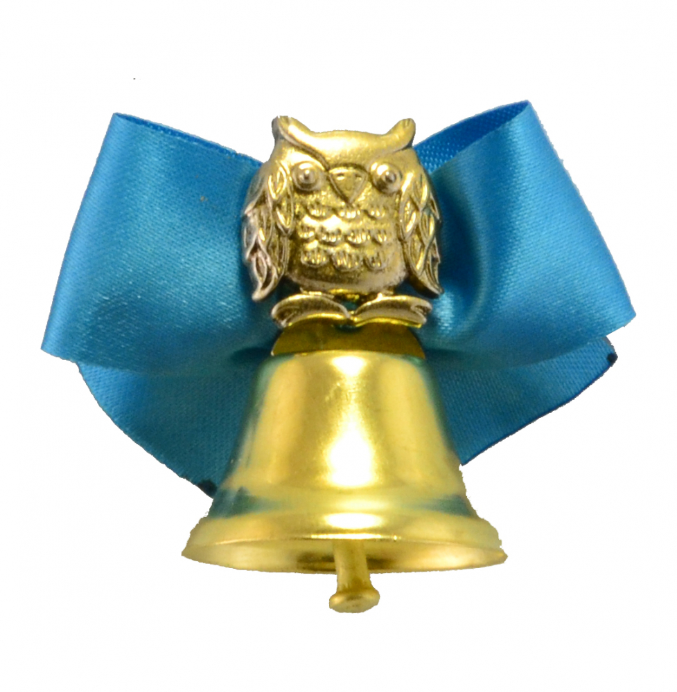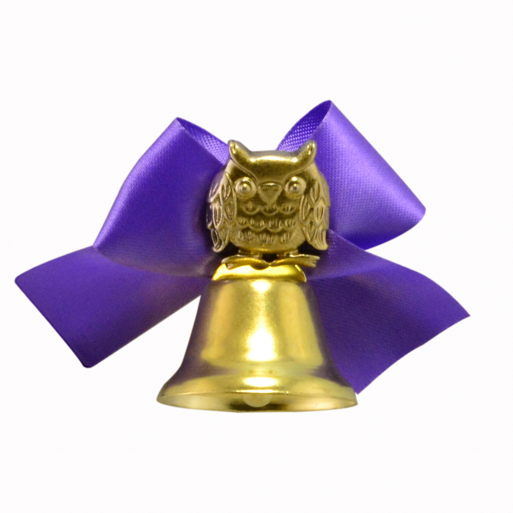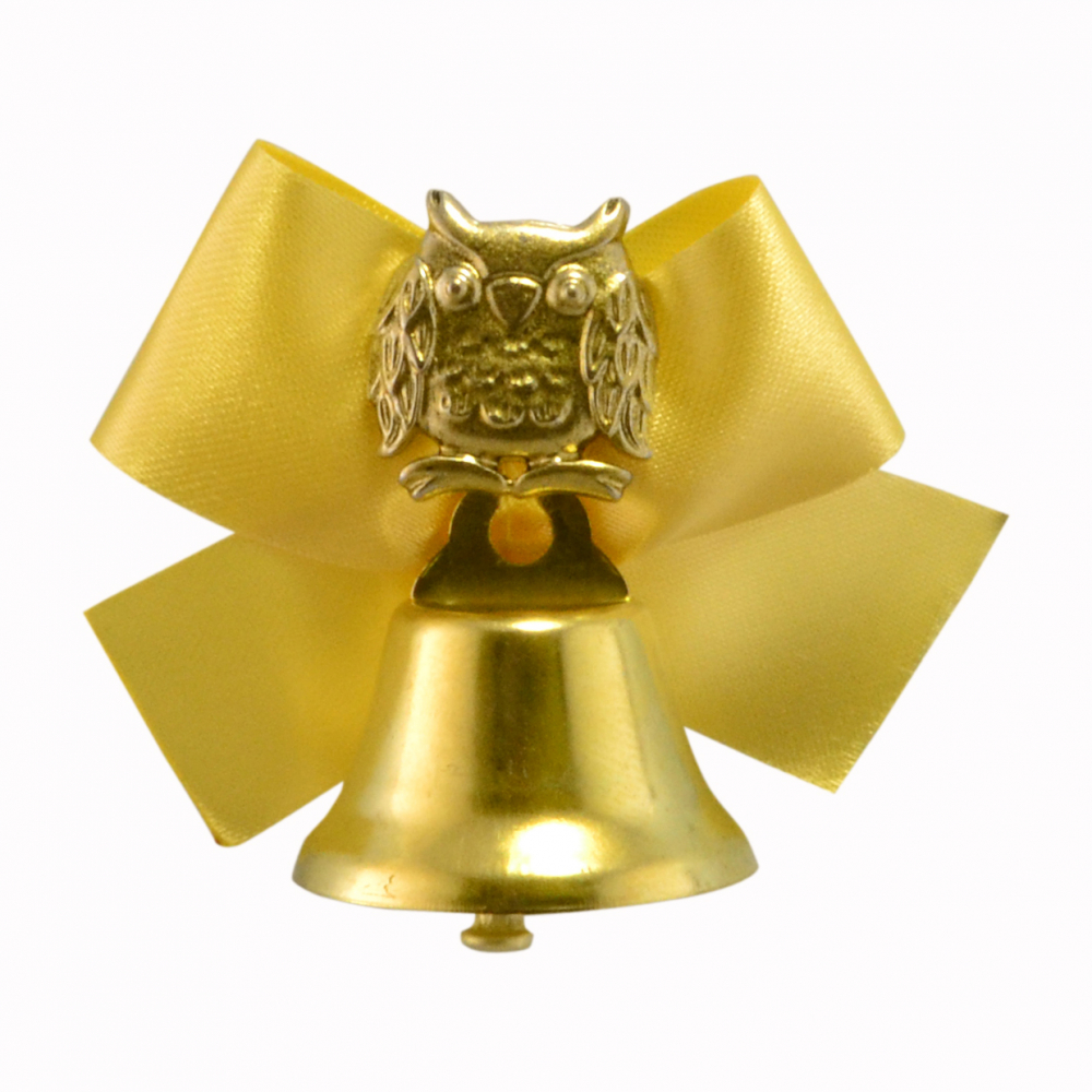 Металлический позолоченный колокольчик с язычком, золотой атласной лентой и совой, крепится при помощи прочной булавки.