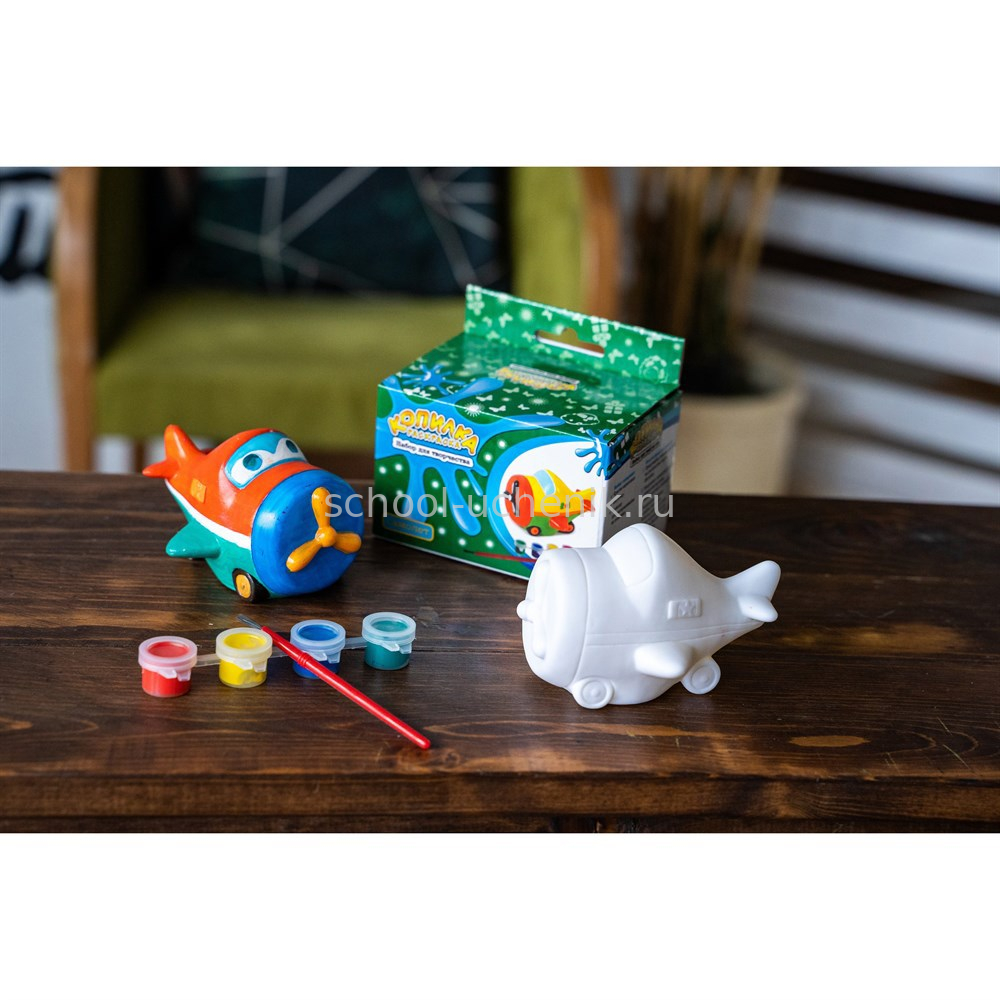 Самолетик — игрушка для мальчишек. А этот самолет еще и настоящая копилка-раскраска, которая надежно сохранит первые сбережения. В наборе есть все, что нужно, чтобы создать красивую поделку: копилка под раскрашивание из пластика, краски основных цветов, кисточка. Нужно тщательно раскрасить все детали — пропеллер, хвост, колеса, крылья, а после можно и поиграть.