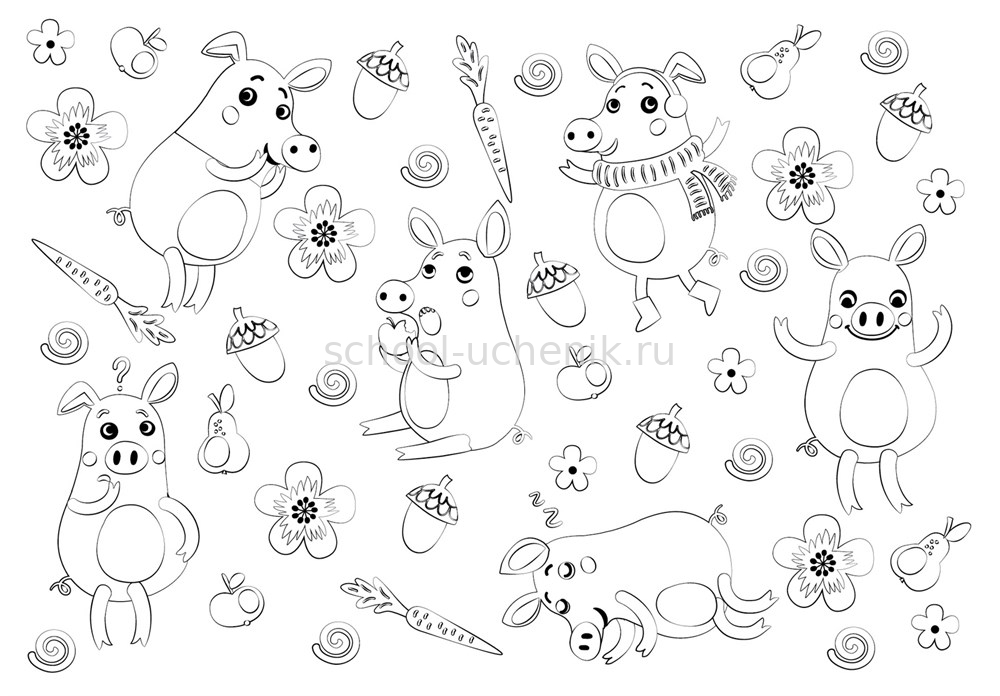 На многоразовый коврик-раскраску уже нанесены контуры будущей картинки — забавные хрюшки и их любимые предметы. Черно-белое изображение можно превратить в цветное, просто раскрасив коврик фломастерами или карандашами. Не бойтесь испортить работу! Краски всегда можно стереть и начать рисовать заново.
